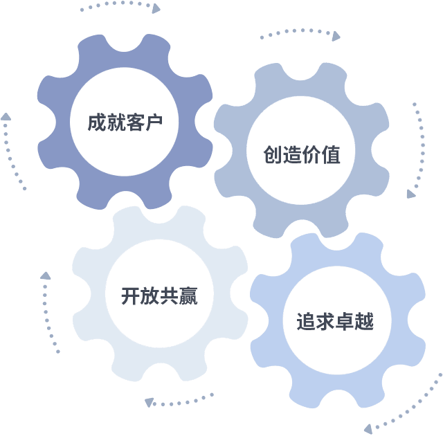 成就客户是一切决策的出发点,,,创造价值是衡量所有工作的标准,,,追求卓越是我们做事做人的态度,,,,开放共赢是我们的格局也是最终的结果。。。价值观的齿轮环环相扣,,,推动着组织里的每个人不断向前。。